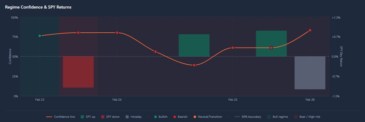 The week of February 23-26, 2026, our regime model called Bull→Bear Transition with Trending character for six consecutive sessions. SPY was rallying into NVIDIA earnings. The direction component of the call looked questionable — markets were going up while we were calling bearish transition.