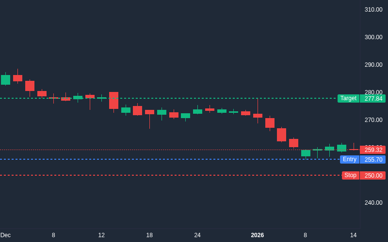 Entry: $255.70Target: $277.84Final: $260.47Stop: $250.00