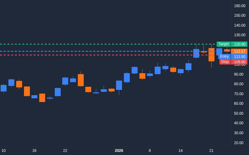 Entry: $113.50Target: $120.90Final: $104.78Stop: $109.80