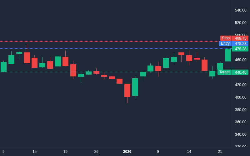 "Quantitative analysis indicates a high-probability short setup with a 3.3:1 risk-reward ratio. Technical metrics show price testing resistance at 479.17 with RSI at 63.12 showing momentum deceleration. Price is currently near low volume node at 482.97, suggesting weak buying pressure at these levels. Volume Profile analysis shows Value Area Low at 440.46, providing a statistical target. The bearish market regime aligns with this setup. Point of Control at 454.63 with high volume nodes clustered below current price suggests potential resistance above. Risk is defined by proximity to key resistance, with R:R offering asymmetric opportunity.