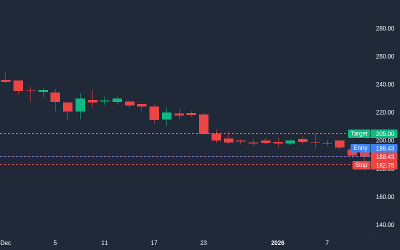 Reason: The stock is in a sideways trend, currently close to support at 182.75 and below both SMA20 and SMA50, which indicates a bearish signal. The last recorded RSI is 24.25, still indicating oversold conditions, but there's no bullish momentum from MACD.. The indicators show neutral to bearish signals. RSI is under 30 (oversold), but SMA's indicate a bearish market condition. With current price below both SMA20 and SMA50, there is conflicting signal strength.. The current risk/reward ratio has det..."
