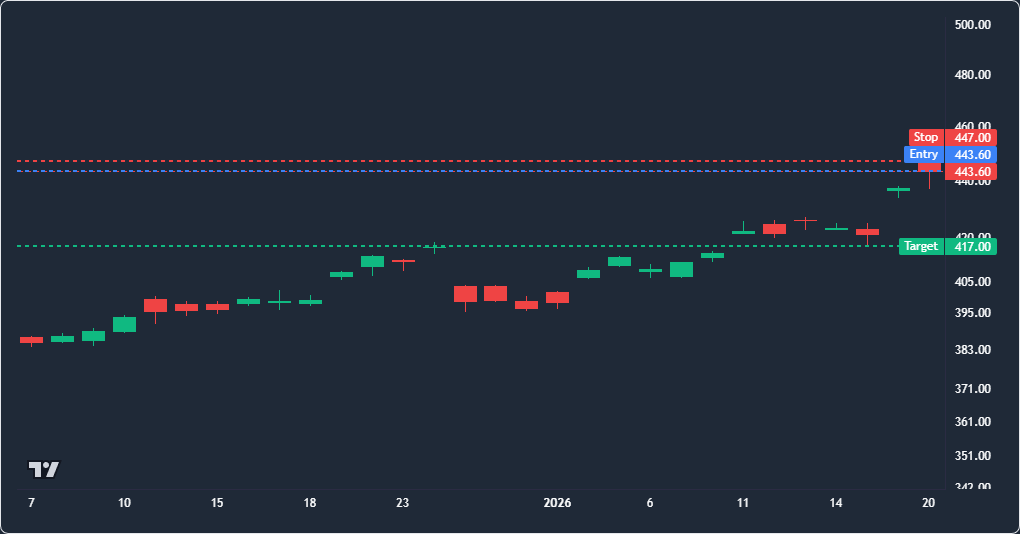 Despite these risks, the technical indicators suggest a potential reversal. The price is nearing the $447 resistance level, which aligns with the stop-loss for this short position. With a risk/reward ratio of 1:7.8, the target of $417 presents a compelling opportunity. Given the lack of recent catalysts and the current overbought conditions, a short position in GLD appears justified. The high confidence in this trade is supported by the technical setup, making it a strategic entry point for those looking to capitalize on a potential downturn."