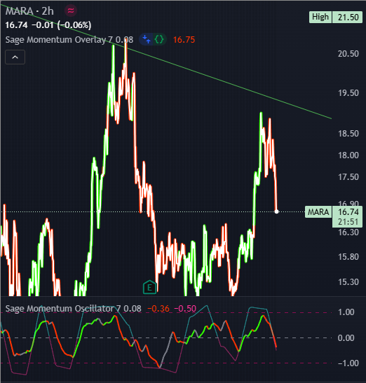 "MARA currently trades at $16.75, reflecting a decline of 5.05% today. Despite this downturn, the stock exhibits a favorable risk/reward ratio of 1:3.1, with a target price of $19 and a stop-loss set at $16. The recent price action indicates a volatile environment; however, it also suggests potential for recovery. Over the past week, MARA has shown resilience, bouncing off key support levels, which could signify a reversal in momentum. While there are no recent catalysts driving MARA's price movement, the technical indicators paint a promising picture. The stock has formed a bullish divergence on the RSI, suggesting that despite recent selling pressure, underlying strength may be building. Additionally, the moving averages are converging, indicating a potential shift in trend direction. The recent price drop could be viewed as a healthy consolidation phase, allowing for accumulation before the next upward move. However, it's essential to acknowledge the contrarian risks involved in taking a long position. A continued decline in Bitcoin prices or adverse regulatory news could negatively impact MARA's performance, as the company is heavily tied to cryptocurrency mining. Furthermore, if broader market sentiment shifts towards risk aversion, MARA could face significant selling pressure, undermining the bullish thesis. In conclusion, despite the recent price decline and lack of immediate catalysts, the technical indicators suggest a potential rebound. The favorable risk/reward ratio, combined with the stock's ability to hold key support levels, supports a long position in MARA. With a target of $19, the potential upside outweighs the risks, making this an attractive opportunity for investors willing to navigate the inherent volatility of the cryptocurrency sector."