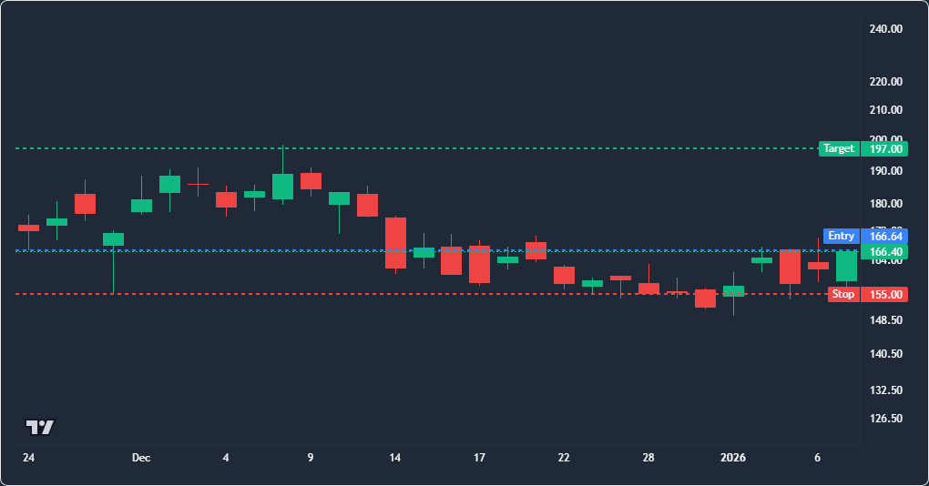 Entry: $166.28Target: $197.00Final: $143.19Stop: $155.00