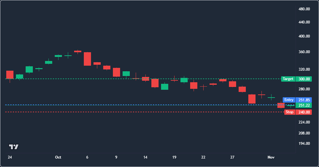 Entry: $251.22Target: $300.00Final: $237.20Stop: $240.00