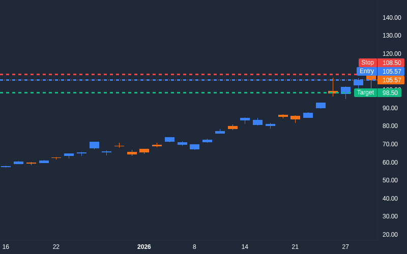 Entry: $105.57Target: $98.50Final: $75.44Stop: $108.50